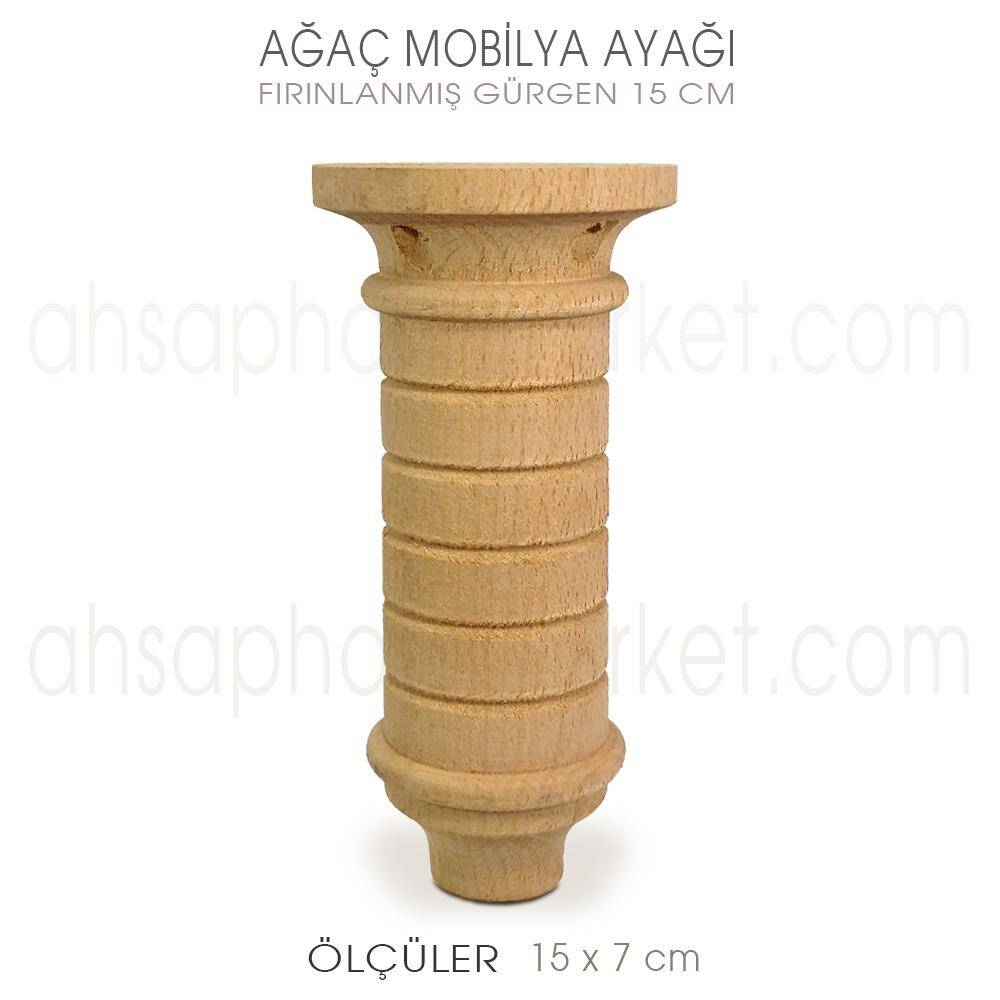 Doğal Ahşap Tornalı Mobilya Ayağı FT 27 Modeli, 15 cm yüksekliğe sahip olup 7 cm çap genişliğine sahiptir. Üzerinde 4 adet vida başlarının içine gömülebildiği havşalı çapraz delik bulunmaktadır.