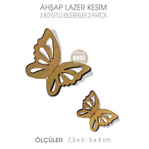 Lazer Kesim Tekniğiyle Üretilen Kelebek Ahşap süsler, 3mm kalınlığa sahip olup, her türlü boya ile boyanabilir. Lazer kesim 3 Boyutlu 2'li Kelebek Seti, her türlü hobi projesinde tamamlayıcı obje olarak kullanılabilir. Kaliteli ve uzun ömürlü olması açısından birinci sınıf A kalite mdf paneller kullanılarak üretilmiştir.