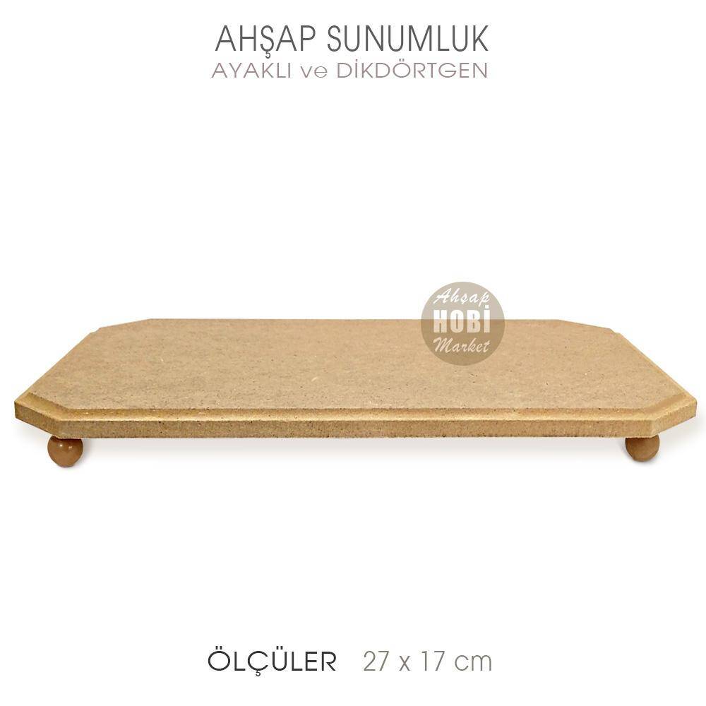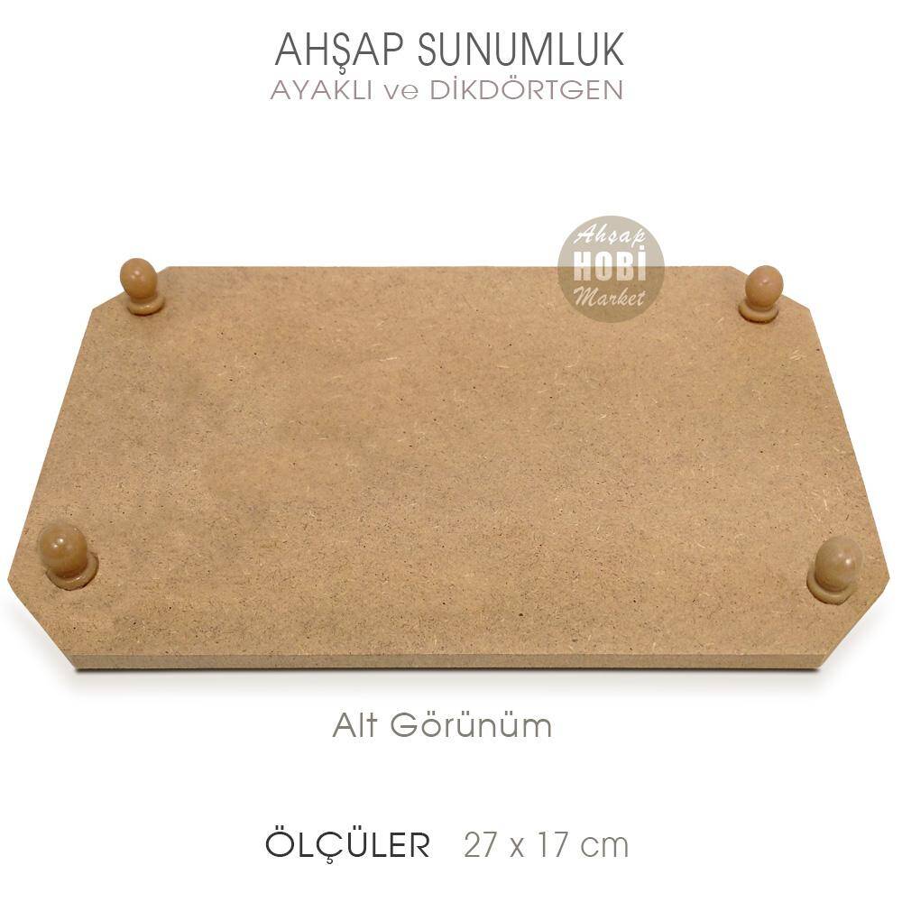 Ahşap ayaklı dikdörtgen sunumluğun üzerindeki tabla 27x17 cm ölçüsündedir. Ürün toplamda 2,5 cm yüksekliğindedir.