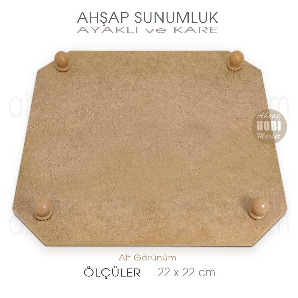 Ahşap ayaklı sunumluğun üzerindeki tabla 22x22 cm ölçüsündedir. Ürün toplamda 2,5 cm yüksekliğindedir.