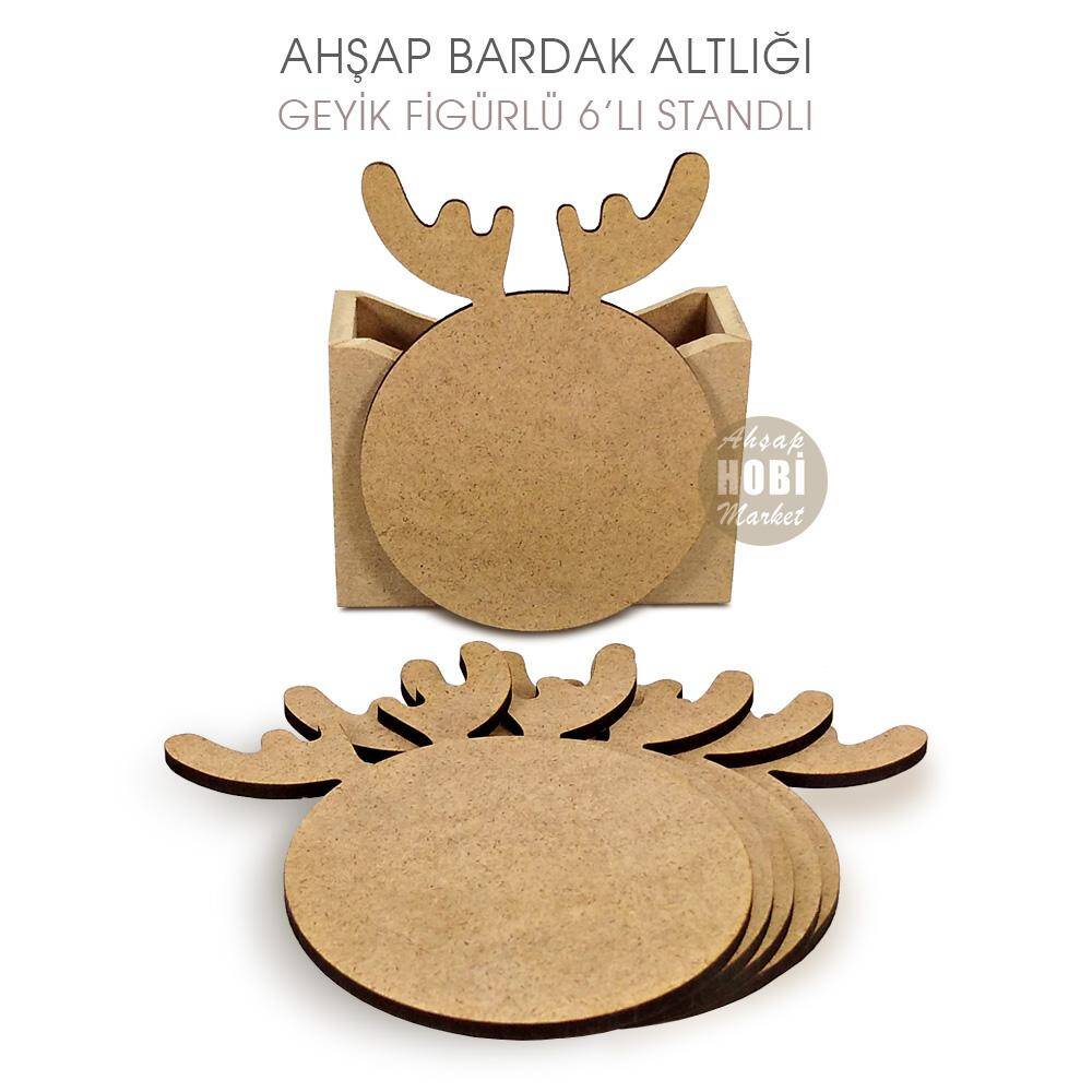 Ahşap standlı geyik figürlü bardak altlıkları 6 adettir. İçerisine koymak için standı vardır. Altlıkların her biri 9 cm çapında olup, kalınlıkları 4 mm dır.