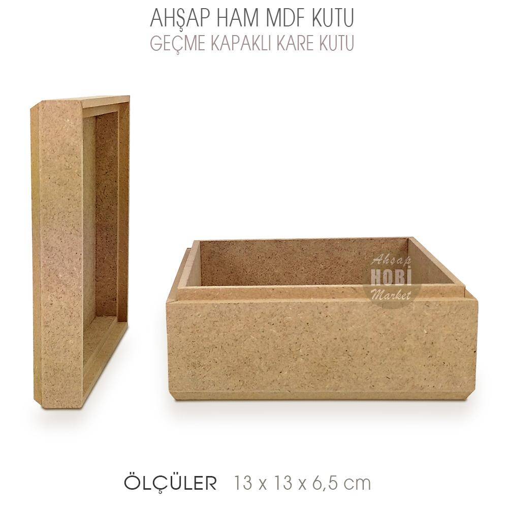 Ahşap Kare Geçme Kapaklı Kutu, 13 cm genişliğinde, 13 cm derinliğinde ve 6,5 cm yüksekliğinde, kare formundadır. Ürün 8mm kalın mdfden üretilmiştir.