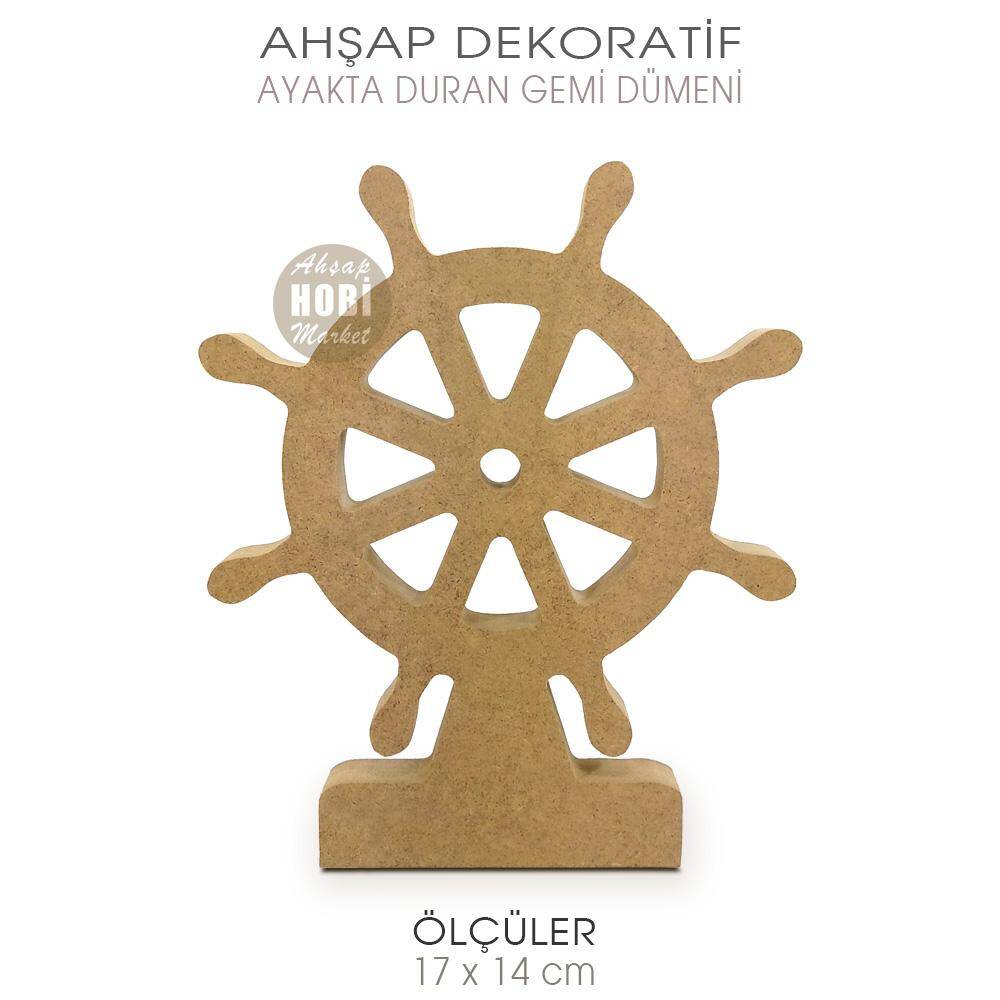 Ahşap Gemi Dümeni, 18 mm kalınlığında mdfden üretilmiş, 17 cm yükseklik, 14 cm genişlik boyutlarına sahip, düz zemin üzerinde ayakta durabilen, boyanabilir ham ahşap objedir.
