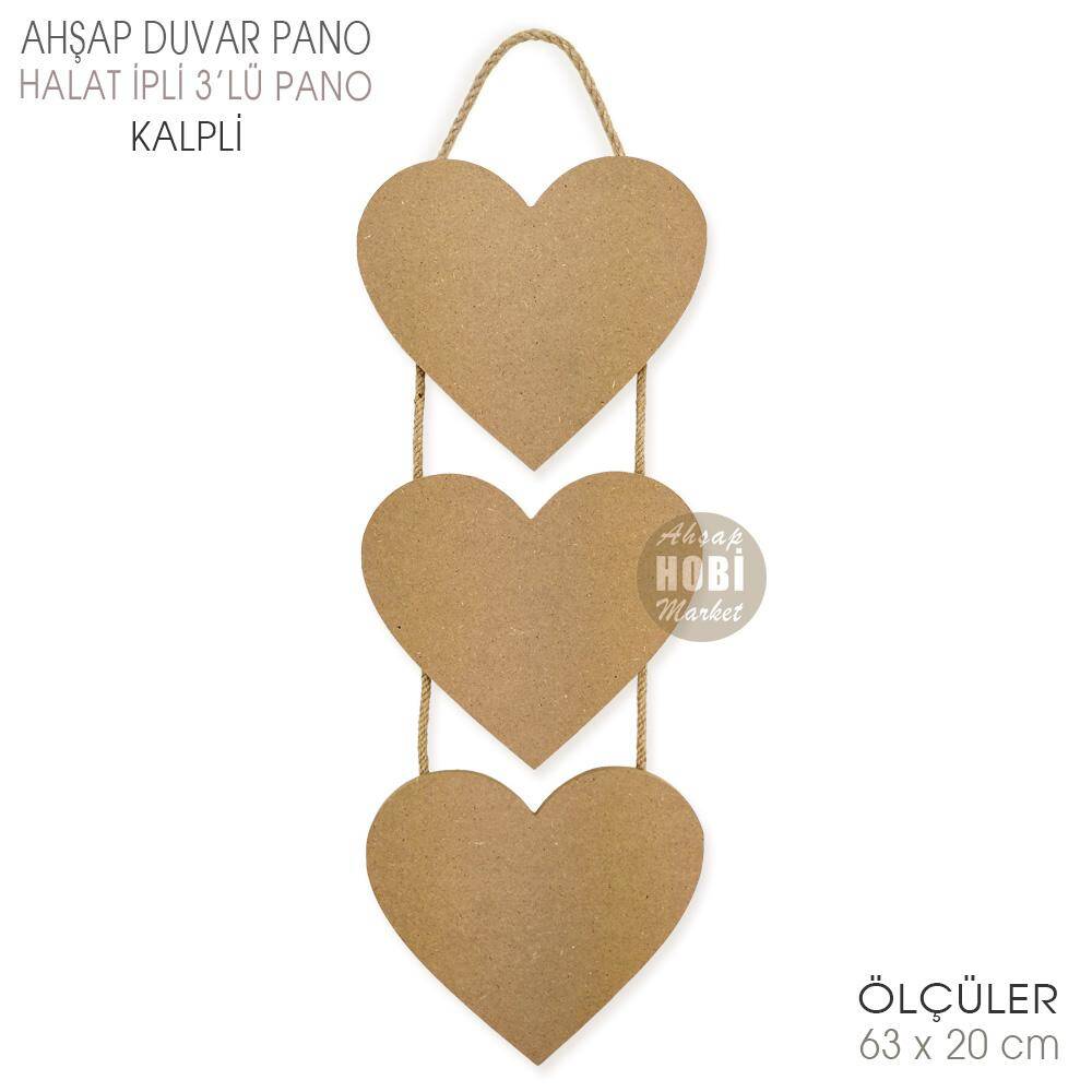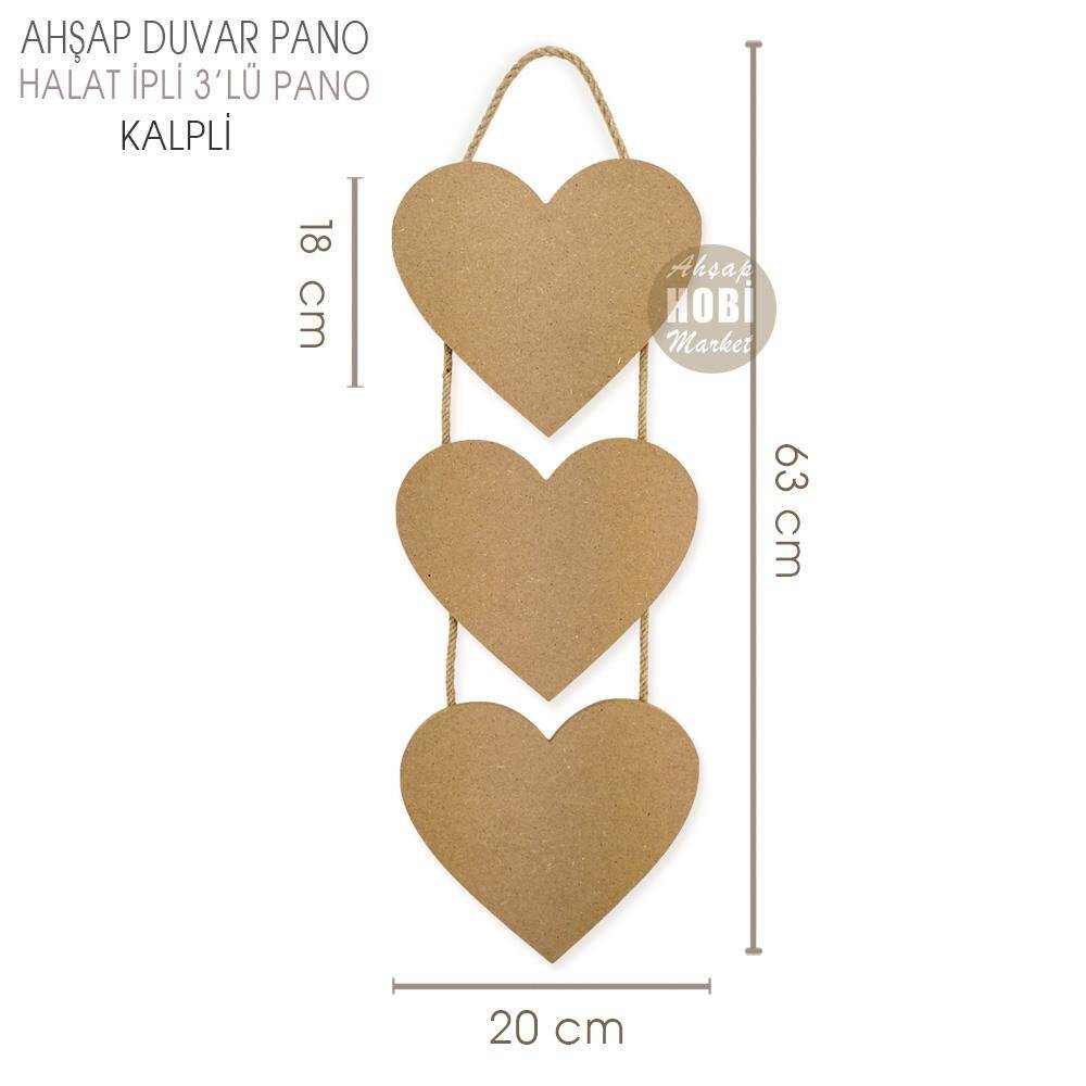 Ahşap İpli 3'lü Kalpli Pano, birinci sınıf 8 mm kalınlığında Çamsan mdfden üretilmiş, hasır halat ile birbirine tutturulmuş 3 adet kalpli panodan oluşmuş ahşap plakalardır. Her türlü dekorasyon trendinde rahatlıkla kullanılabilir, modası geçmeyecek popüler bir pano setidir. Ahşap panolarımız sevkiyata gönderilmeden zımparalanmış, boyamaya hazır olarak paketlenmektedir. Dolayısıyla zımparalamanıza gerek yoktur. Tüm panolar su bazlı olan ve olmayan, akrilik ve sentetik her türlü boya ve verniğe uygun, uzun ömürlü ürünlerdir.