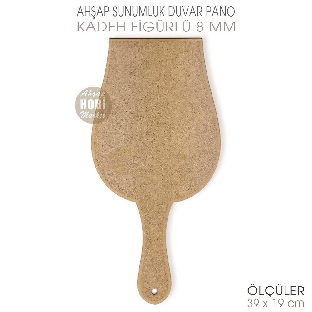 Ahşap Kadeh Görünümlü Sunumluk ve Duvar Pano, 39 cm uzunluğunda, 19 cm genişliğinde ölçülere sahip olup, 8 mm kalınlığındadır. Duvara asabilmek için çivi ve vida deliği bulunmaktadır. Piyasada sıklıkla satılan ince 3 ve 4mm kalınlığı bulunan lazer kesim ürünlerden değildir. Dayanıklı ve uzun ömürlü bir üründür.