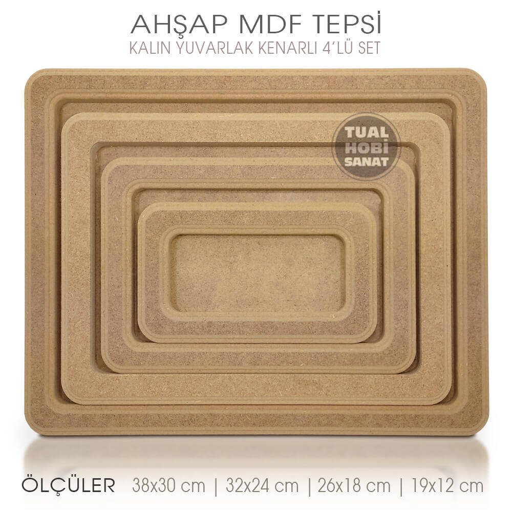 Ahşap Kalın Yuvarlak Kenarlı Dikdörtgen Tepsi Seti, 18 mm kalınlığında kaliteli mdfden üretilmiş, her türlü ahşap boyama tekniğine uygun, tepsi, sunumluk veya duvar panosu olarak kullanılabilen, modası geçmeyecek, işlevsel bir üründür. Ahşap Boyamada tüm tekniklere uygun olarak değerlendirilebilecek, yüksek kaliteli fakat ekonomik fiyatlı, 4 parçadan oluşan bir tepsi setidir.