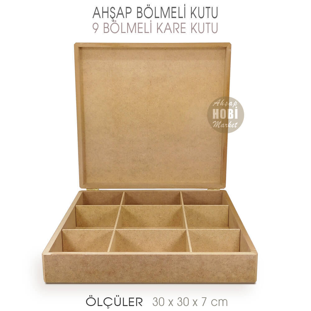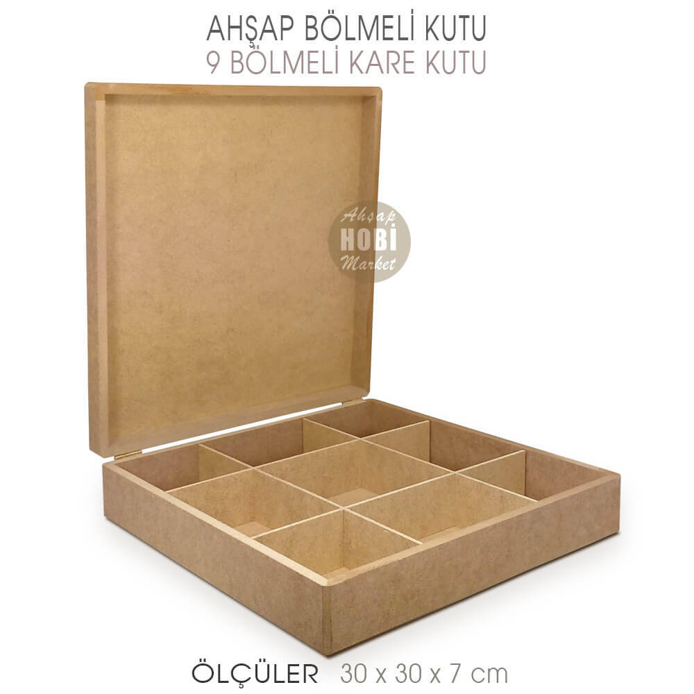 Kare Bölmeli Ahşap Saat ve Mücevher Kutusu, 30 cm genişliğinde, 30 cm derinliğinde ve 7 cm yüksekliğindedir. Kutu içerisinde 1 adet 11x11 cm, 4 adet 11x8 cm, 4 adet 8x8 cm ölçülerinde toplam 9 adet bölme bulunmaktadır.