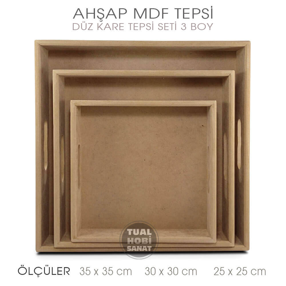 Ahşap Kare Tepsi Seti, 8mm kalınlığında kaliteli mdfden üretilmiş, 5,5-6cm derinliğinde, tüm ahşap boyama tekniklerine uygun, kullanışlı, modası geçmeyecek, ekonomik işlevsel bir üründür. Ahşap Boyamada sıklıkla tepsi ve pano olarak değerlendirilebilecek, yüksek kaliteli fakat ucuz fiyatlı bir tepsidir.