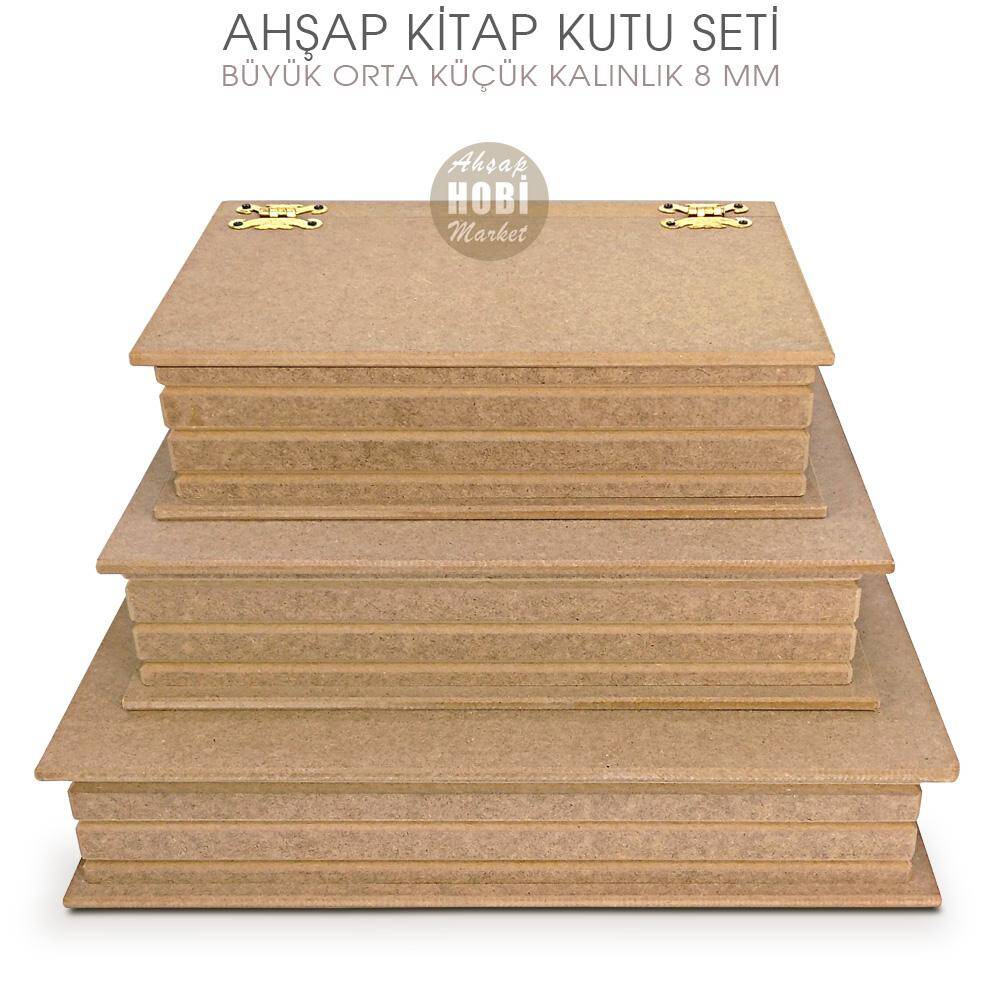Gelince Haber VerAhşap Kitap Kutu Seti, 8 mm birinci kalite mdfden üretilmiş, ciltli kitap görünümlü, kapağı 2 adet antik kelebek menteşe ile tutturulmuş, birinci sınıf işçilikle üretilmiş, 3 adet kitap kutudan oluşan, hem dekoratif, hemde işlevsel olarak kullanılabilen çok amaçlı bir kutudur. Lazer kesim ince kutulardan ve küçük zayıf menteşeli taklitlerinden olmadığı için uzun yıllarca kullanılabilecek bir ürün setidir. Ahşap Kitap Kutular, her türlü hobi ve ticari projelerinizde kullanabileceğiniz, dekoratif bir ürün olmasının yanısıra gizli kasa, değerli evrak ve hatıra eşyalarının saklandığı kutu, tesbih kutusu, hediyelik kitap kutusu, fatura kutusu ve takı kutusu gibi birçok amaçla kullanılabilir.