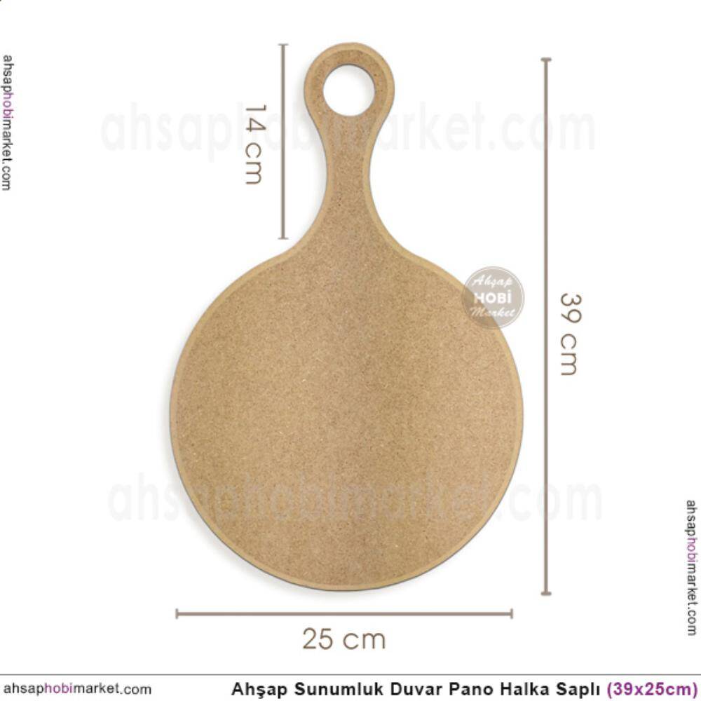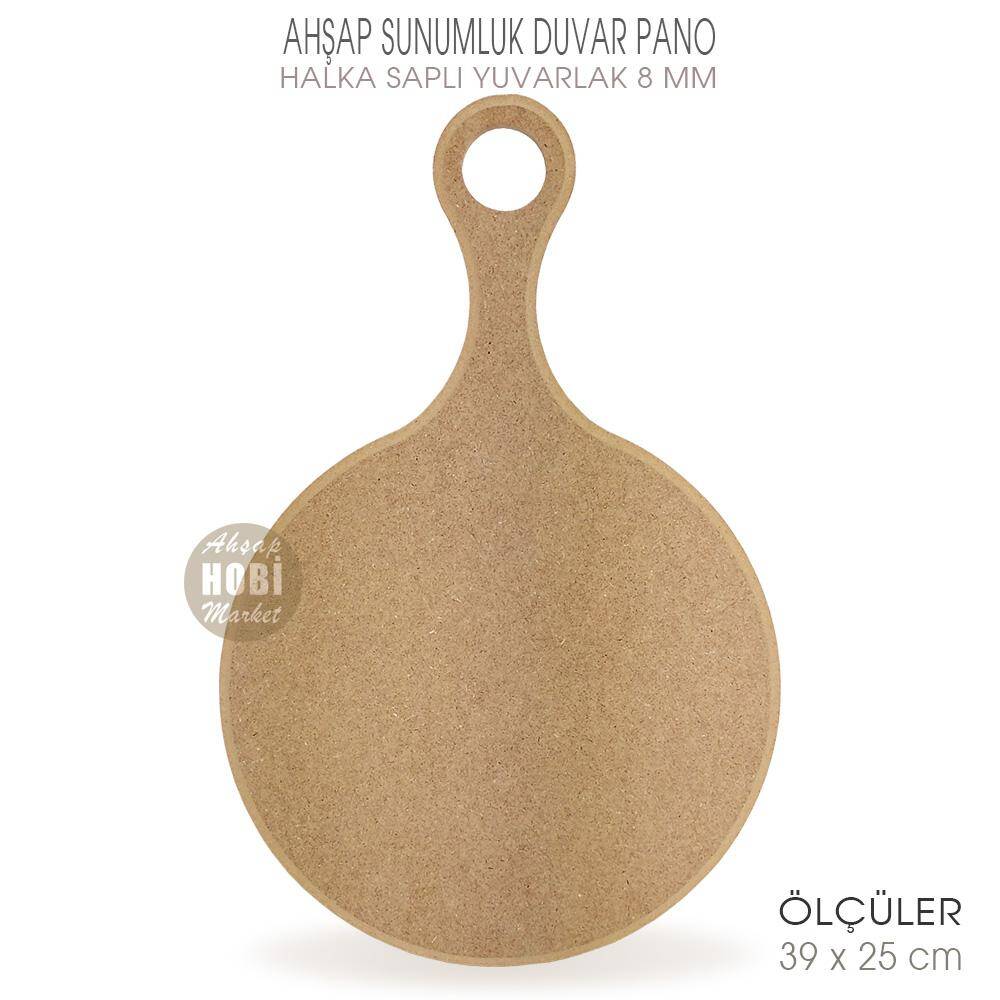 Ahşap Halka Saplı Sunumluk ve Duvar Pano, 39 cm uzunluğunda, 25 cm genişliğinde ölçülere sahip olup, 8 mm kalınlığındadır. Duvara asabilmek için çivi ve vida deliği bulunmaktadır. Piyasada sıklıkla satılan ince tahtadan 3 ve 4 mm kalınlığındaki lazer kesim ürünlerden değildir. Dayanıklı ve uzun ömürlü bir üründür.