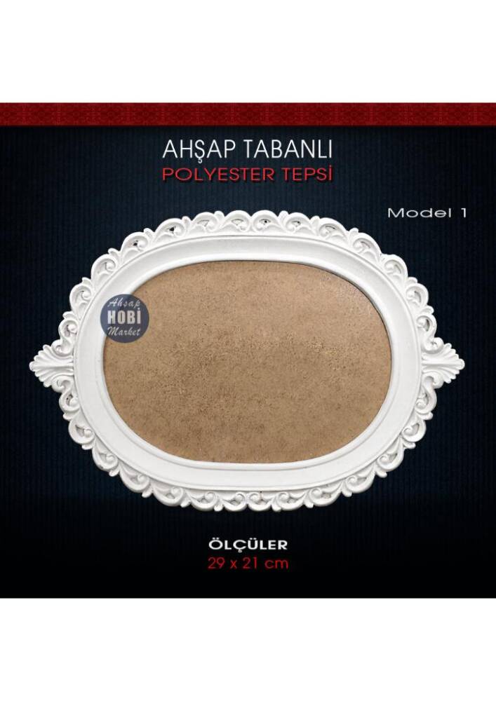 Ham polyester ahşap tabanlı tepsi, 29 cm genişliğinde, 21 cm eninde ve en kalın noktası zeminden 2,5 cm yükseklikte, içi dolu ve her türlü boyaya uygun, kaliteli işçilikle üretilmiş, işlevsel polyester tepsidir.