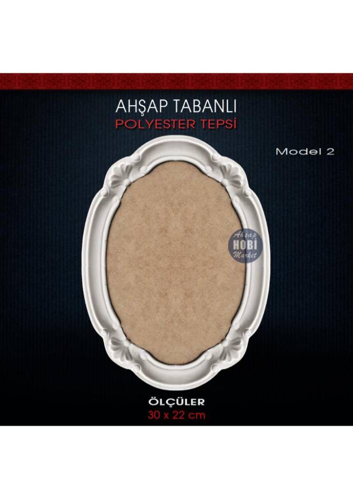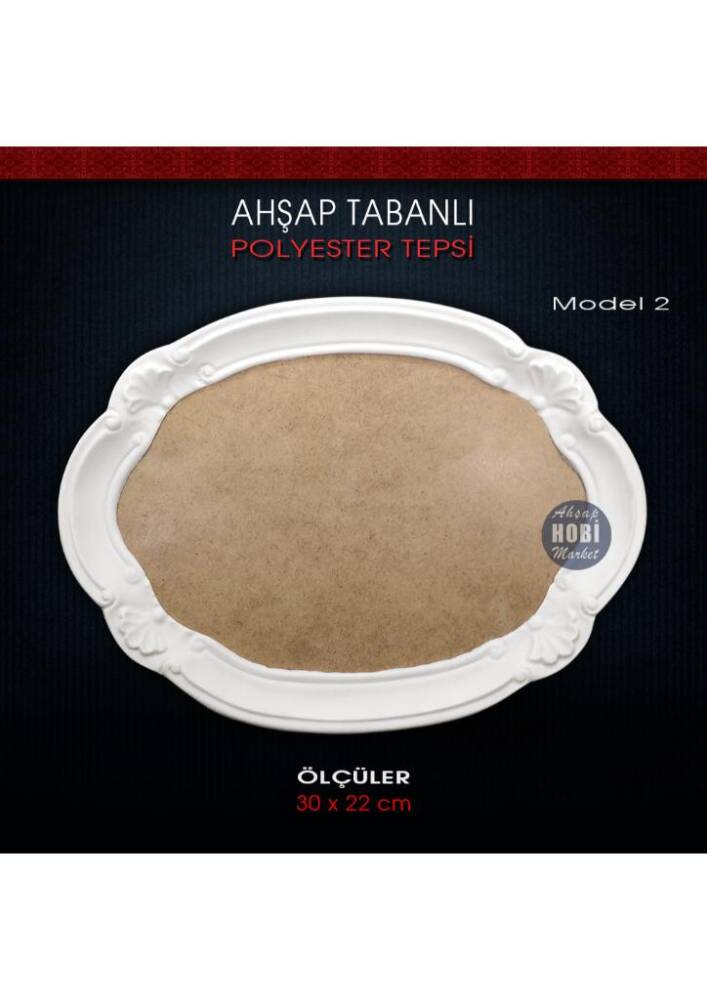 Ham polyester ahşap tabanlı tepsi, 30 cm genişliğinde, 22 cm eninde ve en kalın noktası zeminden 2,5 cm yükseklikte, içi dolu ve her türlü boyaya uygun, kaliteli işçilikle üretilmiş, işlevsel polyester tepsidir.