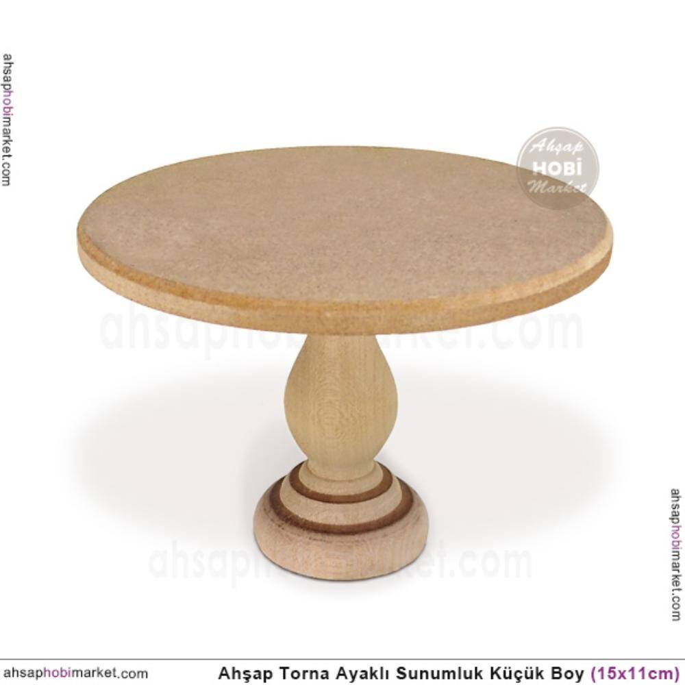 Ahşap torna ayaklı küçük boy sunumluğun üzerindeki tabla 15cm çapındadır. Yüksekliği ise 11cm boyutundadır. Ayak doğal ağaçtan üretilmiştir.