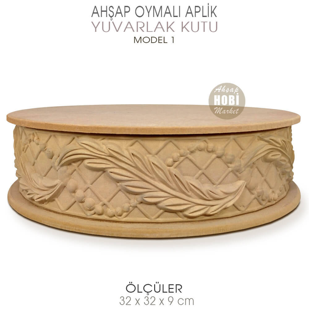 Ahşap Yuvarlak Oymalı Aplik Kutu Model 1, 32 cm çap ölçüsüne ve 9 cm yüksekliğe sahiptir. 8 mm kalın mdfden üretilen yuvarlak kutunun üst kapağı daire şeklinde ve geçmeli olarak dizayn edilmiştir.
