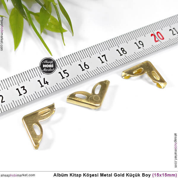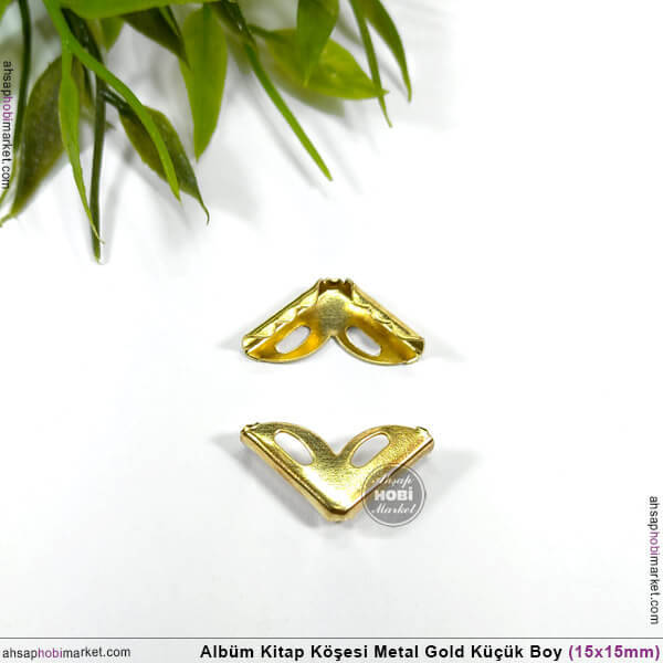 Metal Albüm ve Kitap Köşeleri Altın Renkli kaliteli metalden üretilmiş sarı metal ile kaplanmış olup, 15 mm yüksekliğe, 15 mm genişliğe sahiptir. Kitap kapağının girdiği ara ölçüsü 3 mm boyutundadır.