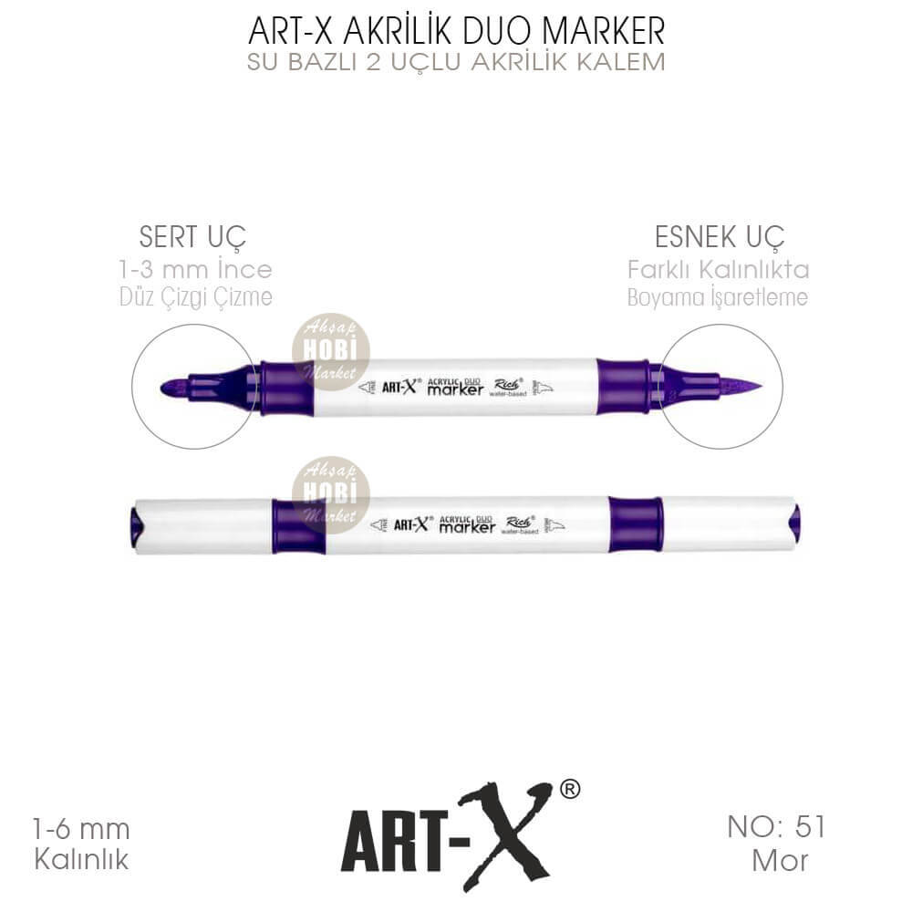 ART-X Akrilik Duo Marker Su Bazlı Akrilik Boya ve Çizim Kalemleri, her türlü hobi projesinde kullanılan, su bazlı, içerisinde sağlığa zararlı toksik madde bulunmayan, ince ve kalın olmak üzere 2 ucu bulunan akrilik işaretleme ve boyama kalemleridir. Özellikle hassas ve detay boyama ve işaretlemeye ihtiyaç duyulan projelerde kullanılır.