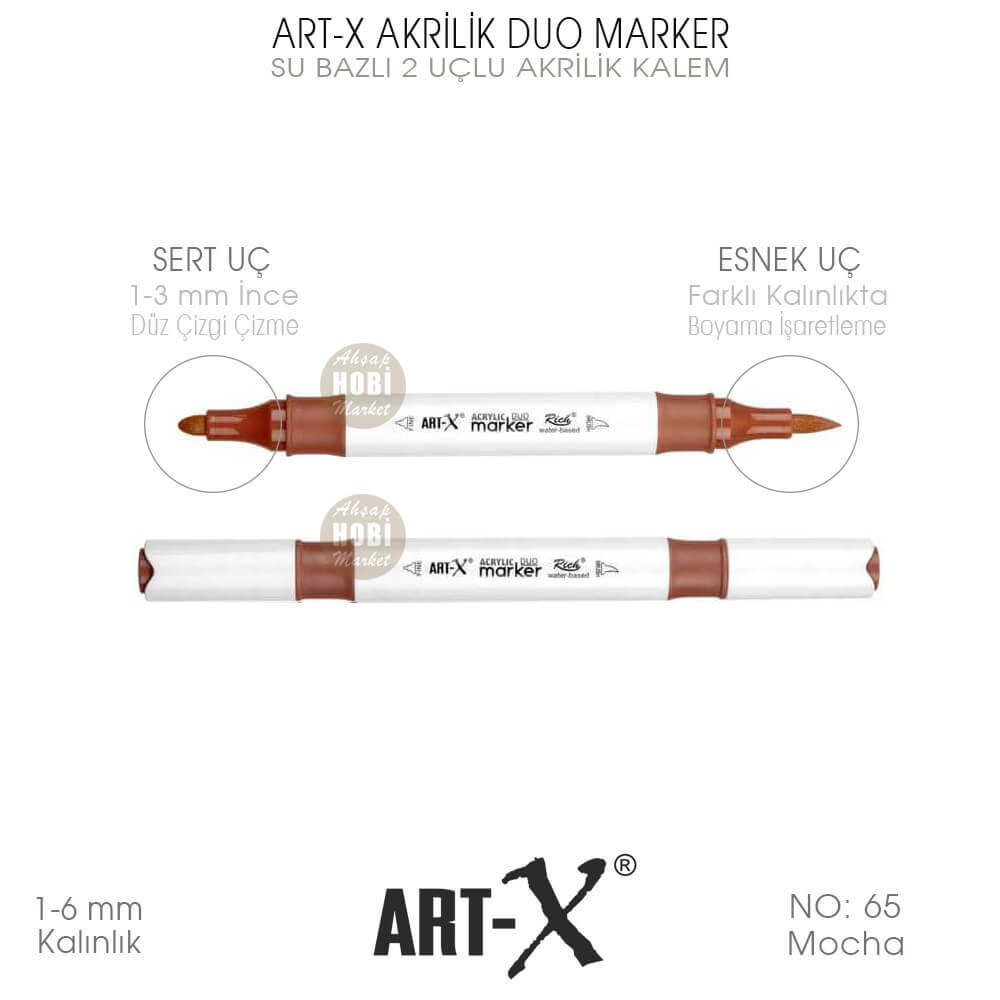 ART-X Akrilik Duo Marker Su Bazlı Akrilik Boya ve Çizim Kalemleri, her türlü hobi projesinde kullanılan, su bazlı, içerisinde sağlığa zararlı toksik madde bulunmayan, ince ve kalın olmak üzere 2 ucu bulunan akrilik işaretleme ve boyama kalemleridir. Özellikle hassas ve detay boyama ve işaretlemeye ihtiyaç duyulan projelerde kullanılır.