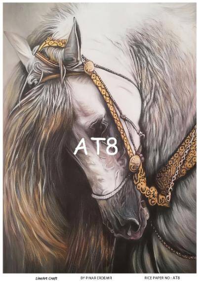 LineArt At Desenli Pirinç Dekopaj - Model : AT08 , pirinç çeltiğinden üretilmiş, her türlü hobi projesinde kullanılabilen, dekopaj tutkalı ile yapıştırılabilen, yapıştırıldığı yüzeyde hava kabarcığı bırakmayan, birinci kalite dekopaj kağıdıdır. Pirinç Dekopajların üzerleindeki desenler, kullanıldığı ürünün görkemli ve üst düzey gözükmesini sağlamaktadır.