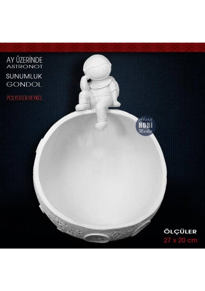 Polyester Ay Üzerinde Astronot Sunumluk, yeni sezon için üretilmiş, kendinden mükemmel desen ve detaylı, ahşap ve seramiğe göre daha kolay boyanabilien, tüm ev dekorasyonunda kullanabileceğiniz dekoratif gondol sunumluk aksesuar objedir. Birinci sınıf polyester malzemesiyle dökülmüş, pürüzsüz ve boyamaya hazır, polyester tabağıyla birlikte her türlü akrilik ve sentetik boyayla boyanabilen, uzun ömürlü dekoratif ve işlevsel bir üründür.