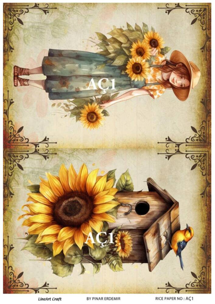 LineArt Ayçiçeği Desenli Pirinç Dekopaj - Model : AÇ01 , pirinç çeltiğinden üretilmiş, her türlü hobi projesinde kullanılabilen, dekopaj tutkalı ile yapıştırılabilen, yapıştırıldığı yüzeyde hava kabarcığı bırakmayan, birinci kalite dekopaj kağıdıdır. Pirinç Dekopajların üzerleindeki desenler, kullanıldığı ürünün görkemli ve üst düzey gözükmesini sağlamaktadır.