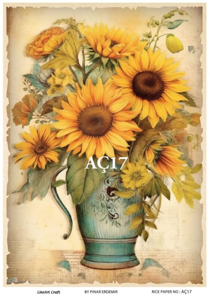 LineArt Ayçiçeği Desenli Pirinç Dekopaj - Model : AÇ17 , pirinç çeltiğinden üretilmiş, her türlü hobi projesinde kullanılabilen, dekopaj tutkalı ile yapıştırılabilen, yapıştırıldığı yüzeyde hava kabarcığı bırakmayan, birinci kalite dekopaj kağıdıdır. Pirinç Dekopajların üzerleindeki desenler, kullanıldığı ürünün görkemli ve üst düzey gözükmesini sağlamaktadır.
