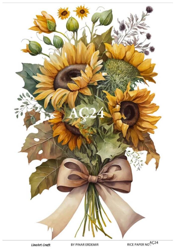 LineArt Ayçiçeği Desenli Pirinç Dekopaj - Model : AÇ24 , pirinç çeltiğinden üretilmiş, her türlü hobi projesinde kullanılabilen, dekopaj tutkalı ile yapıştırılabilen, yapıştırıldığı yüzeyde hava kabarcığı bırakmayan, birinci kalite dekopaj kağıdıdır. Pirinç Dekopajların üzerleindeki desenler, kullanıldığı ürünün görkemli ve üst düzey gözükmesini sağlamaktadır.