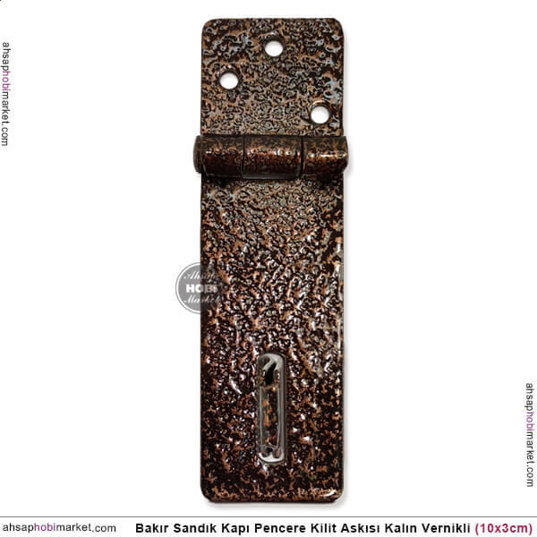 Bakır Sandık Kilit Askıları Oksit Bakır Renkli kaliteli metal sactan üretilmiş olup, 10 cm yüksekliğe, 3 cm genişliğe sahiptir. Ürün 1,2mm kalınlığında kaliteli sac metalden üretilmiş, bakır eskitme ardından verniklenerek kullanıcılara sunulmuştur.