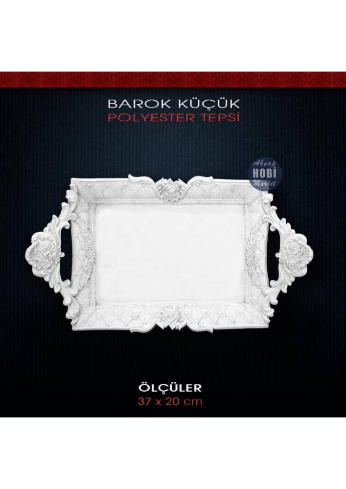 Ham polyester Barok Klasik tepsi, 37 cm genişliğinde, 20 cm eninde ve en kalın noktası zeminden 3 cm yükseklikte, %100 ham polyesterden üretilmiş içi dolu ve her türlü boyaya uygun, kaliteli işçilikle üretilmiş, işlevsel polyester objedir.