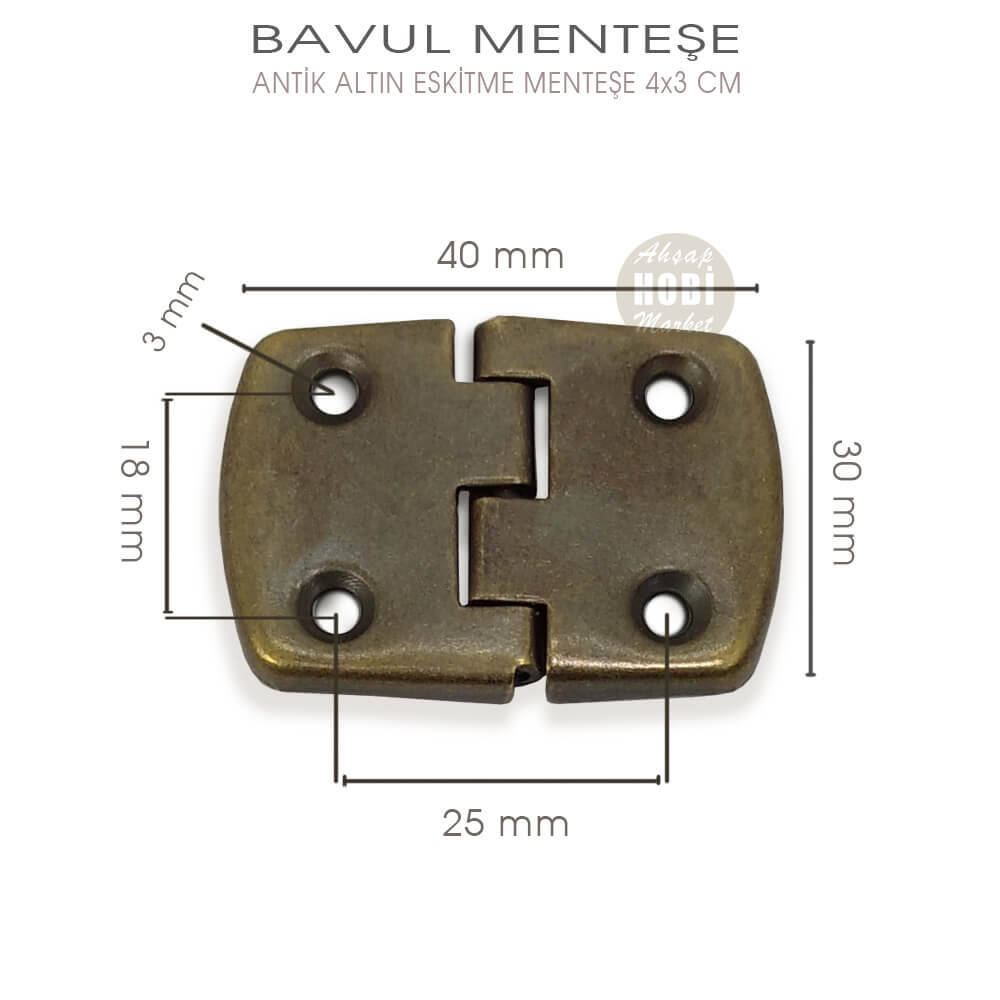 Bavul Menteşeler kaliteli metal sactan üretilmiş olup üzerlerine Antik Altın Renkli oksidasyon kaplama işlemi uygulanmıştır. Bavul menteşeler 4 cm yüksekliğe, 3 cm genişliğe sahip olup, vida deliklerinin çapı 3 mm dir.