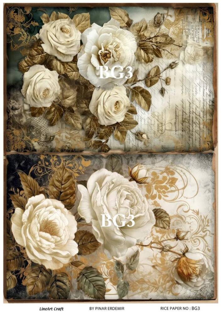 LineArt ,Beyaz Gü,l ,Desenli Pirinç, Dekopaj - Model : BG03 , pirinç, ç,eltiğinden ü,retilmiş, her tü,rlü, hobi projesinde kullanılabilen, dekopaj tutkalı ile yapıştırılabilen, yapıştırıldığı yü,zeyde hava kabarcığı bırakmayan, birinci kalite dekopaj kağıdıdır. Pirinç, Dekopajların ü,zerleindeki desenler, kullanıldığı ü,rü,nü,n gö,rkemli ve ü,st dü,zey gö,zü,kmesini sağlamaktadır.