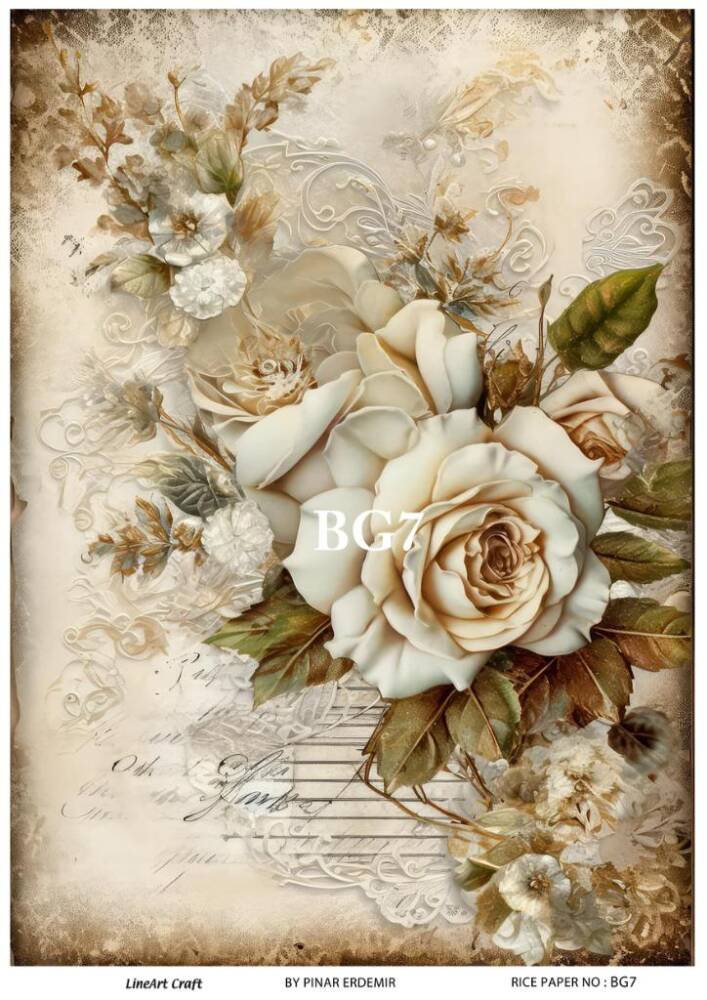 LineArt ,Beyaz Gü,l ,Desenli Pirinç, Dekopaj - Model : BG07 , pirinç, ç,eltiğinden ü,retilmiş, her tü,rlü, hobi projesinde kullanılabilen, dekopaj tutkalı ile yapıştırılabilen, yapıştırıldığı yü,zeyde hava kabarcığı bırakmayan, birinci kalite dekopaj kağıdıdır. Pirinç, Dekopajların ü,zerleindeki desenler, kullanıldığı ü,rü,nü,n gö,rkemli ve ü,st dü,zey gö,zü,kmesini sağlamaktadır.