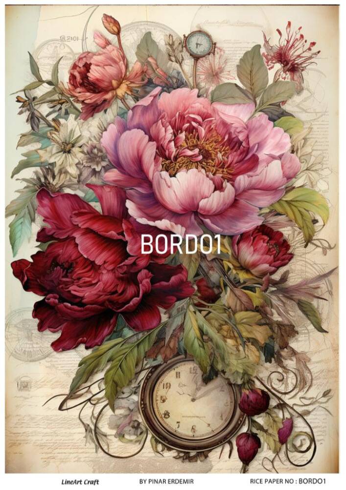 LineArt Bordo Ç,iç,ek Desenli Pirinç, Dekopaj - Model : ,BORDO 01 , pirinç, ç,eltiğinden ü,retilmiş, her tü,rlü, hobi projesinde kullanılabilen, dekopaj tutkalı ile yapıştırılabilen, yapıştırıldığı yü,zeyde hava kabarcığı bırakmayan, birinci kalite dekopaj kağıdıdır. Pirinç, Dekopajların ü,zerleindeki desenler, kullanıldığı ü,rü,nü,n gö,rkemli ve ü,st dü,zey gö,zü,kmesini sağlamaktadır.