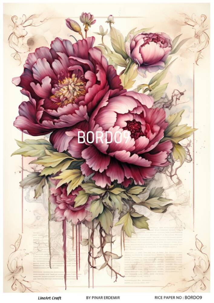 LineArt Bordo Ç,iç,ek Desenli Pirinç, Dekopaj - Model : ,BORDO 09 , pirinç, ç,eltiğinden ü,retilmiş, her tü,rlü, hobi projesinde kullanılabilen, dekopaj tutkalı ile yapıştırılabilen, yapıştırıldığı yü,zeyde hava kabarcığı bırakmayan, birinci kalite dekopaj kağıdıdır. Pirinç, Dekopajların ü,zerleindeki desenler, kullanıldığı ü,rü,nü,n gö,rkemli ve ü,st dü,zey gö,zü,kmesini sağlamaktadır.
