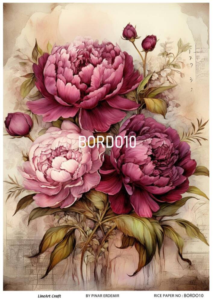 LineArt Bordo Ç,iç,ek Desenli Pirinç, Dekopaj - Model : ,BORDO 10 , pirinç, ç,eltiğinden ü,retilmiş, her tü,rlü, hobi projesinde kullanılabilen, dekopaj tutkalı ile yapıştırılabilen, yapıştırıldığı yü,zeyde hava kabarcığı bırakmayan, birinci kalite dekopaj kağıdıdır. Pirinç, Dekopajların ü,zerleindeki desenler, kullanıldığı ü,rü,nü,n gö,rkemli ve ü,st dü,zey gö,zü,kmesini sağlamaktadır.