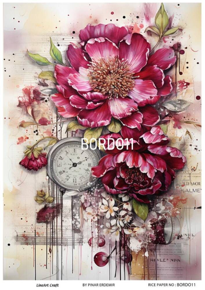 LineArt Bordo Ç,iç,ek Desenli Pirinç, Dekopaj - Model : ,BORDO 11, pirinç, ç,eltiğinden ü,retilmiş, her tü,rlü, hobi projesinde kullanılabilen, dekopaj tutkalı ile yapıştırılabilen, yapıştırıldığı yü,zeyde hava kabarcığı bırakmayan, birinci kalite dekopaj kağıdıdır. Pirinç, Dekopajların ü,zerleindeki desenler, kullanıldığı ü,rü,nü,n gö,rkemli ve ü,st dü,zey gö,zü,kmesini sağlamaktadır.