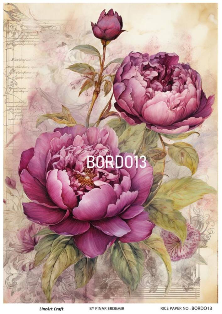 LineArt Bordo Ç,iç,ek Desenli Pirinç, Dekopaj - Model : ,BORDO 13, pirinç, ç,eltiğinden ü,retilmiş, her tü,rlü, hobi projesinde kullanılabilen, dekopaj tutkalı ile yapıştırılabilen, yapıştırıldığı yü,zeyde hava kabarcığı bırakmayan, birinci kalite dekopaj kağıdıdır. Pirinç, Dekopajların ü,zerleindeki desenler, kullanıldığı ü,rü,nü,n gö,rkemli ve ü,st dü,zey gö,zü,kmesini sağlamaktadır.