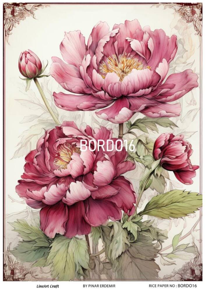 LineArt Bordo Ç,iç,ek Desenli Pirinç, Dekopaj - Model : ,BORDO 16 , pirinç, ç,eltiğinden ü,retilmiş, her tü,rlü, hobi projesinde kullanılabilen, dekopaj tutkalı ile yapıştırılabilen, yapıştırıldığı yü,zeyde hava kabarcığı bırakmayan, birinci kalite dekopaj kağıdıdır. Pirinç, Dekopajların ü,zerleindeki desenler, kullanıldığı ü,rü,nü,n gö,rkemli ve ü,st dü,zey gö,zü,kmesini sağlamaktadır.