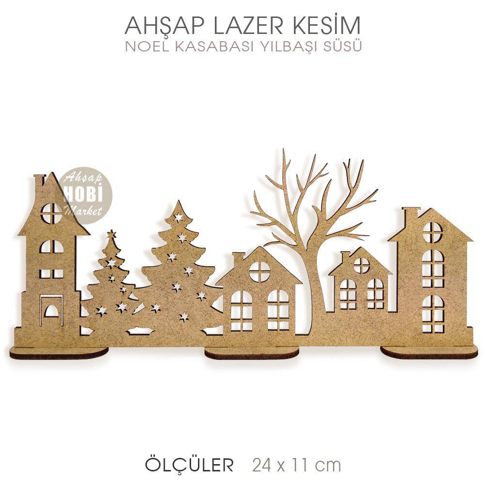 Ahşap Lazer Kesim Boyutlu Kasaba Yılbaşı Dekoru, 11 cm yüksekliğinde, 24 cm genişliğinde, 2 cm derinliğinde ölçülere sahiptir.