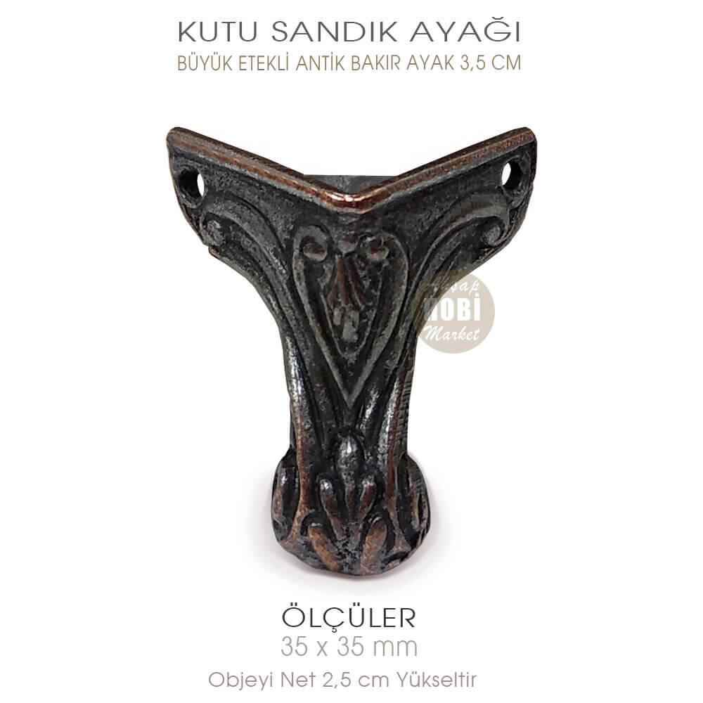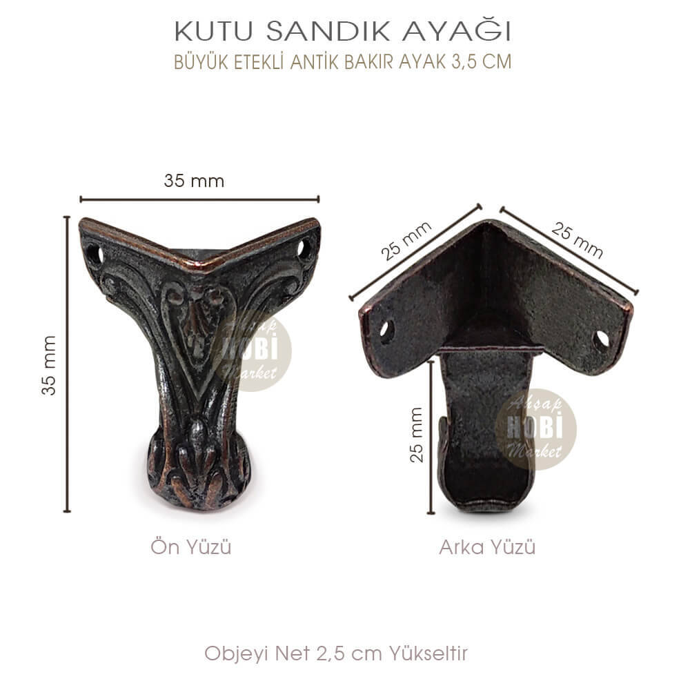 Büyük boy antik bakır renkli etekli köşe paslanmaz metal kutu ayakları uygulandığı objeyi zeminden net 2,5 cm yükseltmektedir. Ürünün dışarıdan 3,5 cm genişliği, 3,5 cm yüksekliği bulunmaktadır.