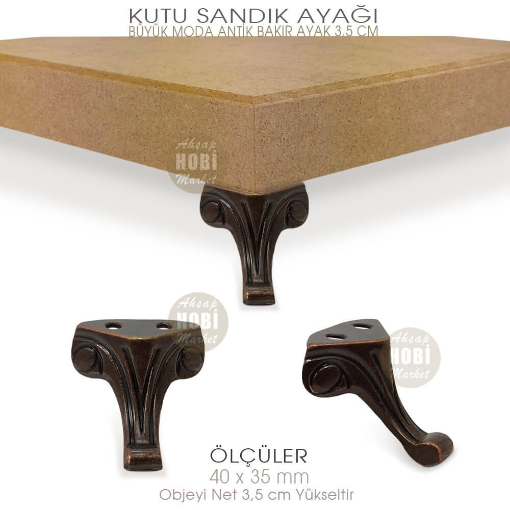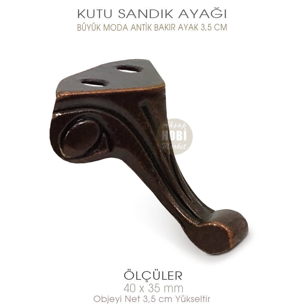 Büyük boy antik bakır renkli moda model paslanmaz metal kutu ayakları uygulandığı objeyi net 3,5 cm yükseltmektedir. Ürünün genişliği 4 cm, yüksekliği 3,5 cm boyutundadır. İki vida arası 1,5 cm ölçüsündedir.