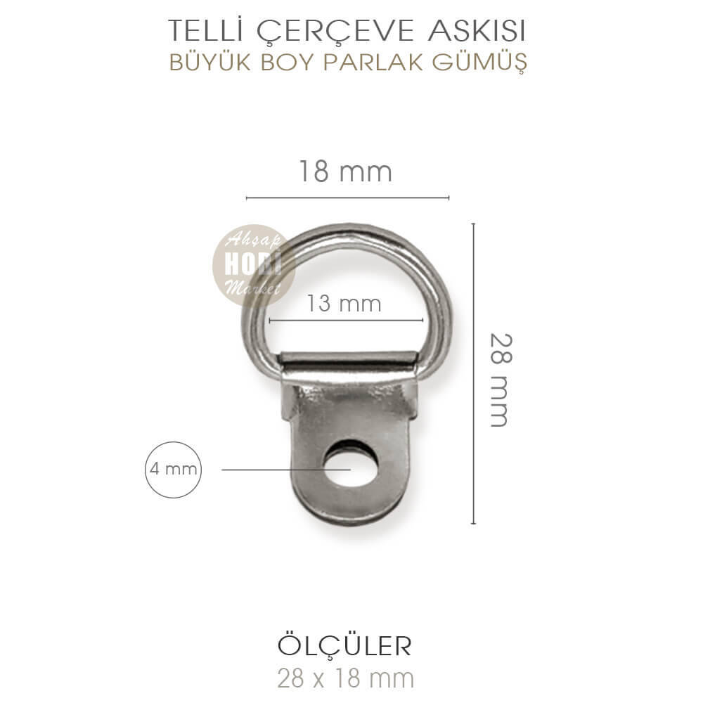 Büyük Telli Çerçeve Askısının Uzunluğu 2,8 cm, tel kısmı genişliği 1,8 cm, vidalama kısmı genişliği ise 1 cm boyutundadır. Vida deliği ise 4 mm çapındadır.