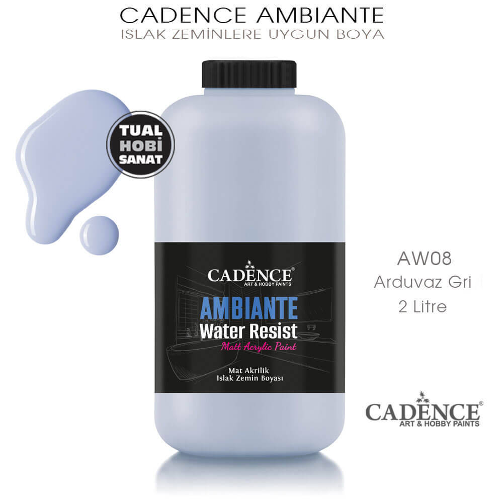 Cadence Ambiante AW08 Arduvaz Gri Renkli ıslak zemin boyaları, iç ve dış mekanlar için, zımparalamaya gerek olmaksızın her türlü zeminde astarsız kullanılabilen, içine karıştırılan katalizör ile suya dayanıklı, yeni nesil akrilik boyadır. Özellikle su ve buhar ile temas eden boyalı vernikli ve verniksiz objeleri yenilemek için tercih edilen boyadır. Suya dayanıklı ıslak zemin yenileme boyası olarak da bilinir. Vernikli ve verniksiz tüm yüzeylerde kullanılabilir. Akıcı, mat renkli, tüm yüzeylere tutunabilen, astar ve zımpara gerektirmeyen boyadır.