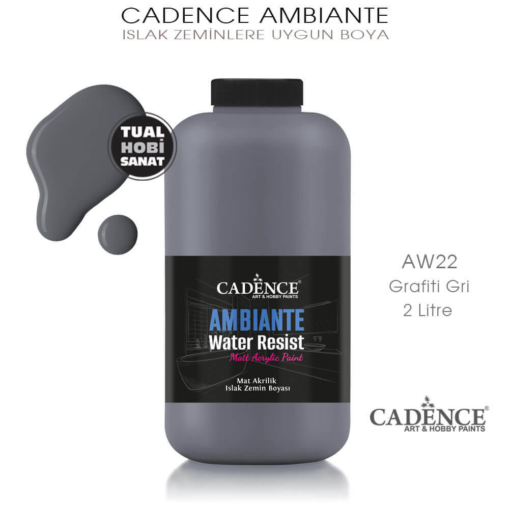 Cadence Ambiante AW22 Grafiti Gri Renkli ıslak zemin boyaları, iç ve dış mekanlar için, zımparalamaya gerek olmaksızın her türlü zeminde astarsız kullanılabilen, içine karıştırılan katalizör ile suya dayanıklı, yeni nesil akrilik boyadır. Özellikle su ve buhar ile temas eden boyalı vernikli ve verniksiz objeleri yenilemek için tercih edilen boyadır. Suya dayanıklı ıslak zemin yenileme boyası olarak da bilinir. Vernikli ve verniksiz tüm yüzeylerde kullanılabilir. Akıcı, mat renkli, tüm yüzeylere tutunabilen, astar ve zımpara gerektirmeyen boyadır.