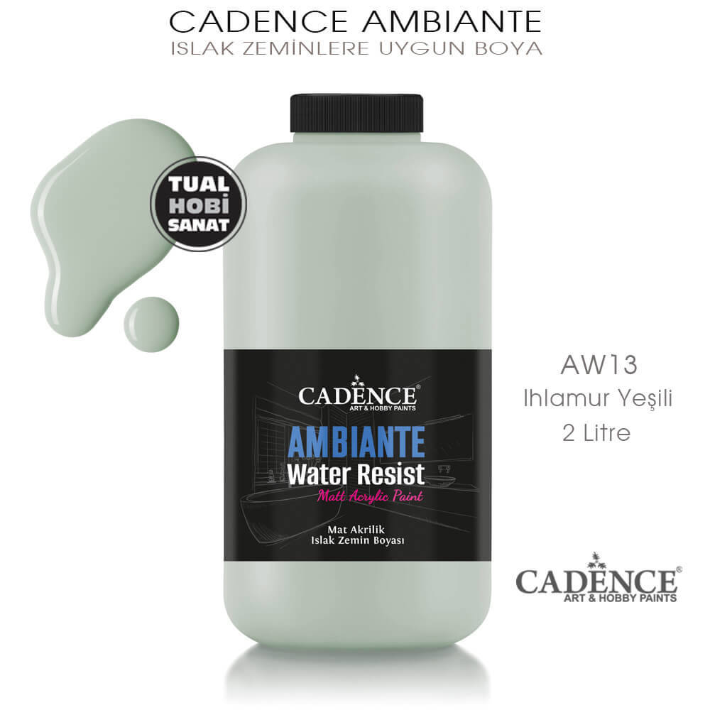 Cadence Ambiante AW13 Ihlamur Yeşili Renkli ıslak zemin boyaları, iç ve dış mekanlar için, zımparalamaya gerek olmaksızın her türlü zeminde astarsız kullanılabilen, içine karıştırılan katalizör ile suya dayanıklı, yeni nesil akrilik boyadır. Özellikle su ve buhar ile temas eden boyalı vernikli ve verniksiz objeleri yenilemek için tercih edilen boyadır. Suya dayanıklı ıslak zemin yenileme boyası olarak da bilinir. Vernikli ve verniksiz tüm yüzeylerde kullanılabilir. Akıcı, mat renkli, tüm yüzeylere tutunabilen, astar ve zımpara gerektirmeyen boyadır.