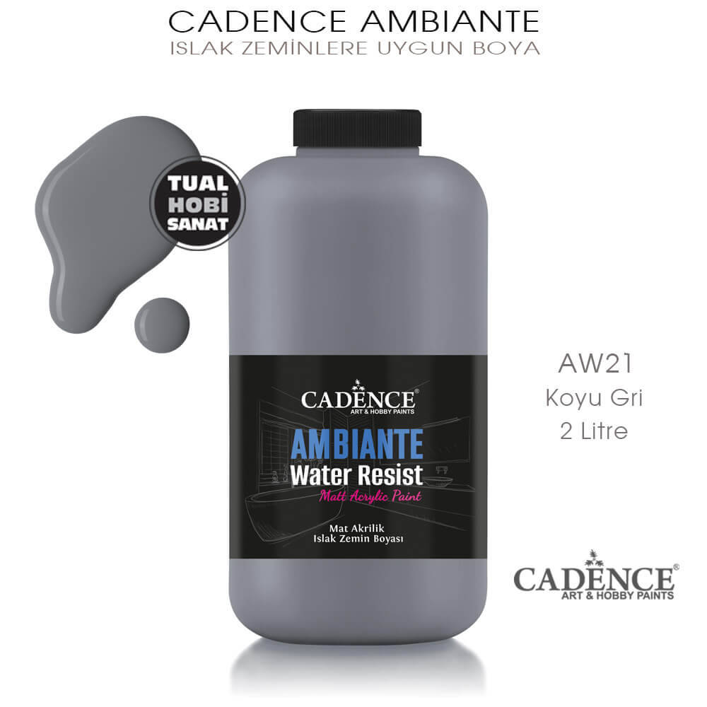 Cadence Ambiante AW21 Koyu Gri Renkli ıslak zemin boyaları, iç ve dış mekanlar için, zımparalamaya gerek olmaksızın her türlü zeminde astarsız kullanılabilen, içine karıştırılan katalizör ile suya dayanıklı, yeni nesil akrilik boyadır. Özellikle su ve buhar ile temas eden boyalı vernikli ve verniksiz objeleri yenilemek için tercih edilen boyadır. Suya dayanıklı ıslak zemin yenileme boyası olarak da bilinir. Vernikli ve verniksiz tüm yüzeylerde kullanılabilir. Akıcı, mat renkli, tüm yüzeylere tutunabilen, astar ve zımpara gerektirmeyen boyadır.