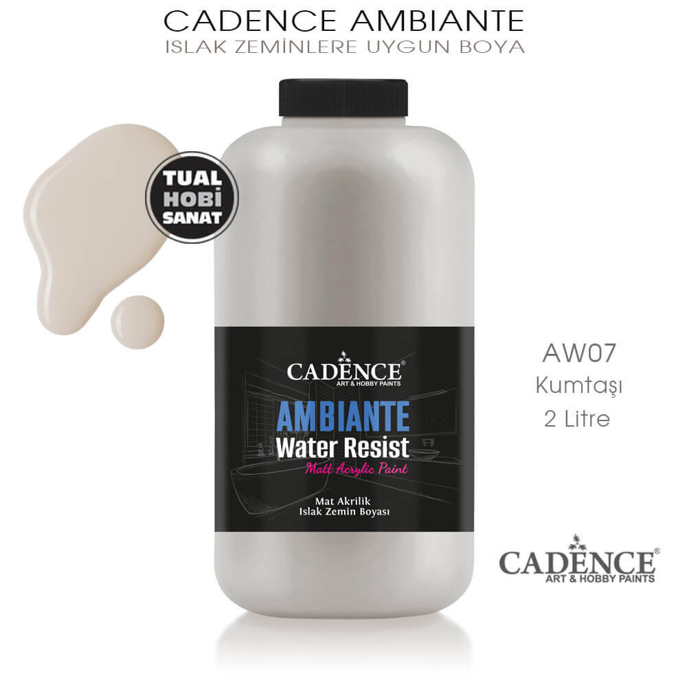 Cadence Ambiante AW07 Kumtaşı Renkli ıslak zemin boyaları, iç ve dış mekanlar için, zımparalamaya gerek olmaksızın her türlü zeminde astarsız kullanılabilen, içine karıştırılan katalizör ile suya dayanıklı, yeni nesil akrilik boyadır. Özellikle su ve buhar ile temas eden boyalı vernikli ve verniksiz objeleri yenilemek için tercih edilen boyadır. Suya dayanıklı ıslak zemin yenileme boyası olarak da bilinir. Vernikli ve verniksiz tüm yüzeylerde kullanılabilir. Akıcı, mat renkli, tüm yüzeylere tutunabilen, astar ve zımpara gerektirmeyen boyadır.