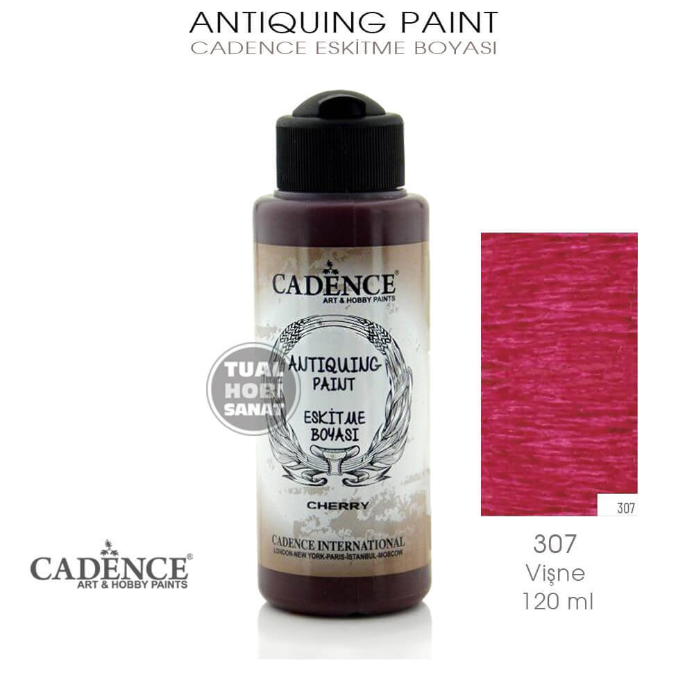 Gelince Haber VerCadence vişne renkli antiquing eskitme boyası, su ve glazing medyum ile inceltilebilen, özellikle polyester gibi detaylı ve girintili yüzeylerde başarılı sonuçlar veren, su bazlı eskitme boyasıdır. Akışkan bir yapıya sahip olan cadence eskitme boyaları, diğer boyalardan daha geç korumakta, dolayısıyla üzerinde daha fazla kurumadan çalışılabilmektedir. Yüzeye sürüldükten sonra ıslak bir sünger yardımıyla istenildiği kadar silinebilmekte, detay ve çukur bölgelerde silinmeden kalan boya, objeye eskimiş bir görünüm kazandırmaktadır.