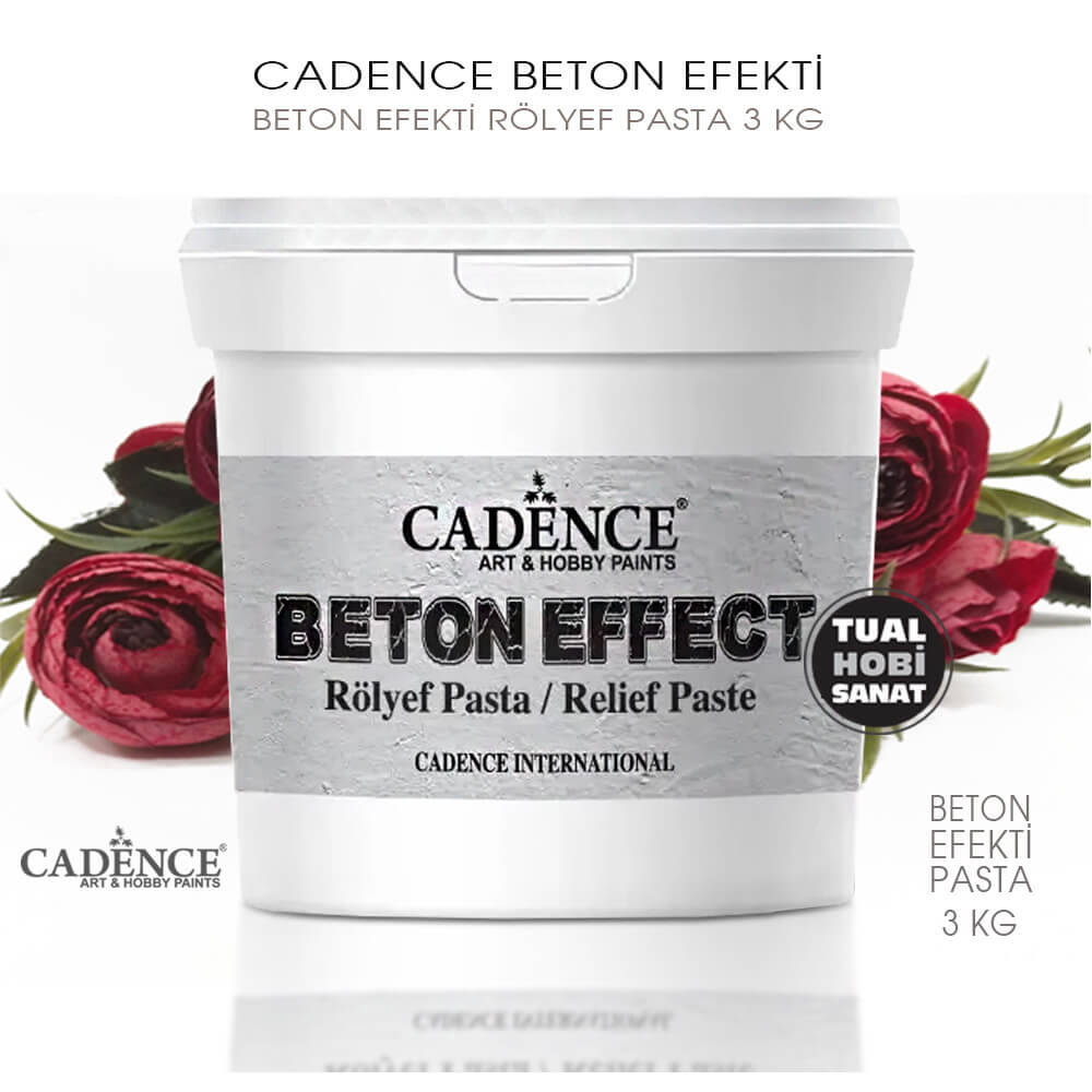 Emici olan veya olmayan tüm yüzeylere uygulanabilen ve objelerde betonla yapılmış izlenimi bırakan cadence beton efekti, bir rölyef pastadır. Boyama tamponlama yöntemiyle, spatula yardımıyla ve hatta ince bir katman isteniyorsa fırça ile uygulanabilir. Kuruduğunda rahatlıkla zımpara ile zımparalanabilir. Beton efekti uyguladığınız objelere eskimiş görünüm vermek için yosun efekti ve antiquing eskitme boyaları ile sıklıkla uygulama yapılmaktadır.