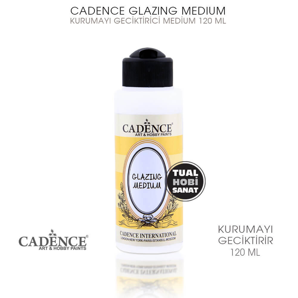 Cadence Glazing Medium boyayla karıştırıldığında, boyanın geç kurumasını sağlar ve bu özellik boya yapan sanatçıya zaman kazandırır. Çalışmada aynı yağlı boyada olduğu gibi ekleme, silme ve değiştirme işlemlerini yapabilir. Özellikle objelere ağaç budak deseni verme işleminde sıklıkla kullanılır.
