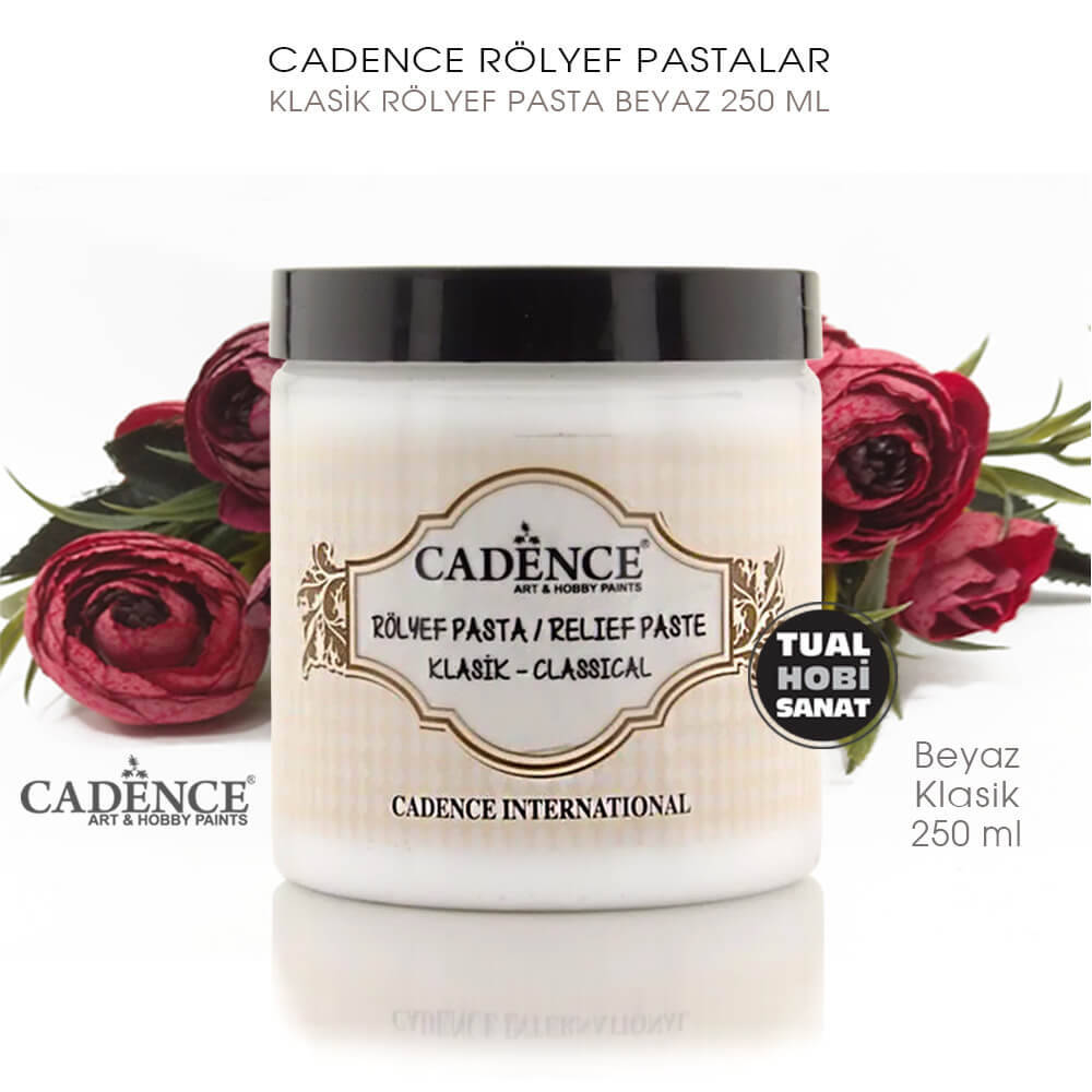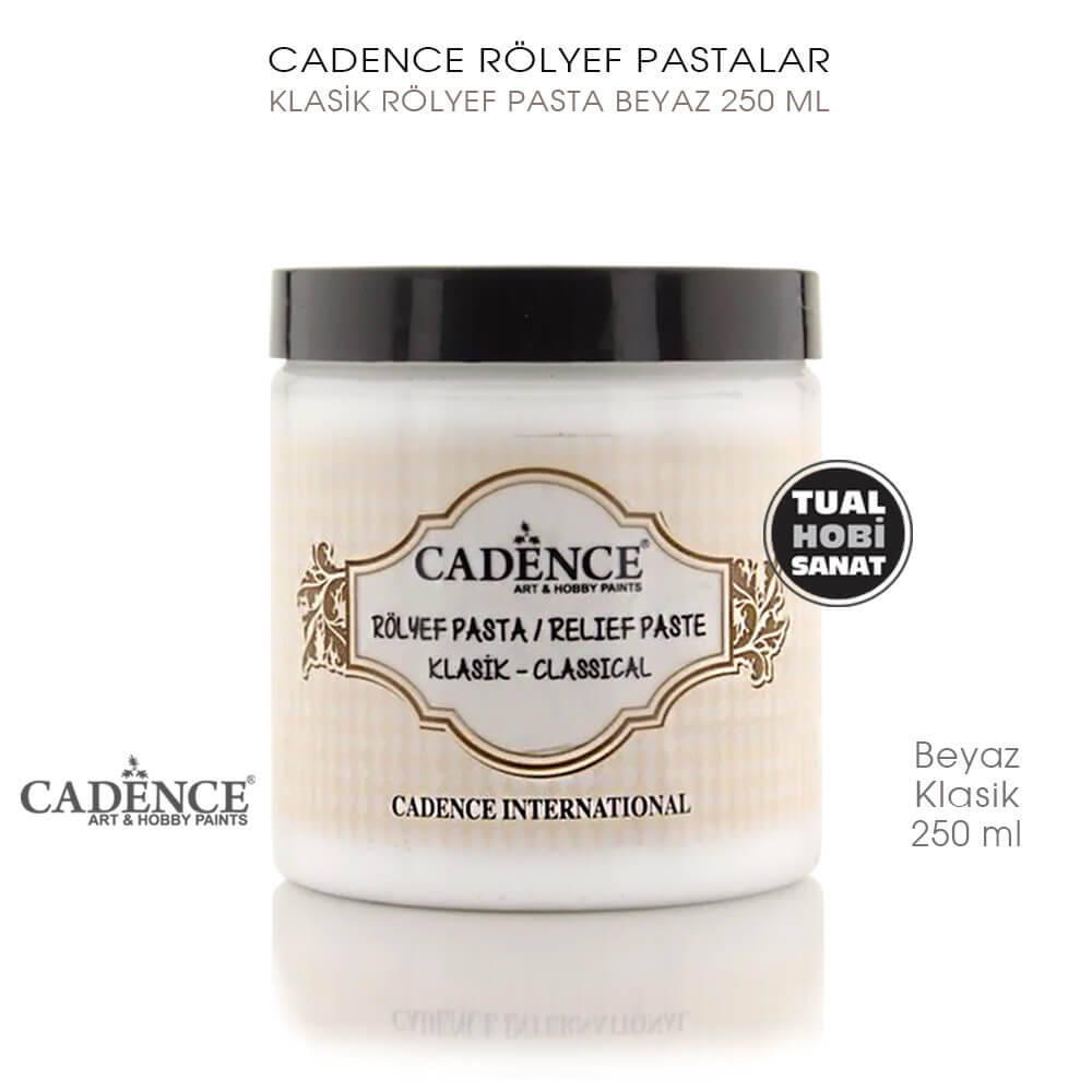 Cadence Klasik Rölyef Pasta, ahşap, metal, polyester, seramik, cam vb. her türlü yüzeyde kullanılabilen, stencil ve şablonlar vasıtasıyla veya spatula yardımı ile serbest çalışma yaparak kabartılı yüzeyler elde etmek üzere kullanılan, macunumsu, yumuşak fakat akıcı olmayan dolgu malzemesidir. Hobi projelerinde uzun yıllardır kullanılan rölyef pasta, popülerliğini çok ve esnek kullanımı sayesinde hiç yitirmemiştir.